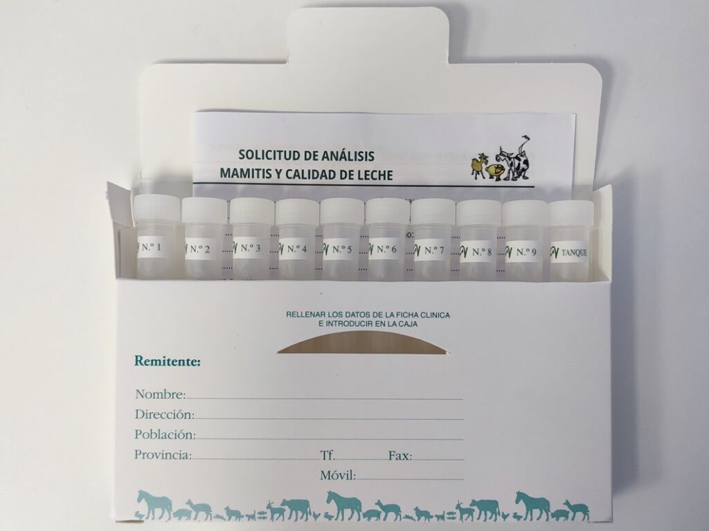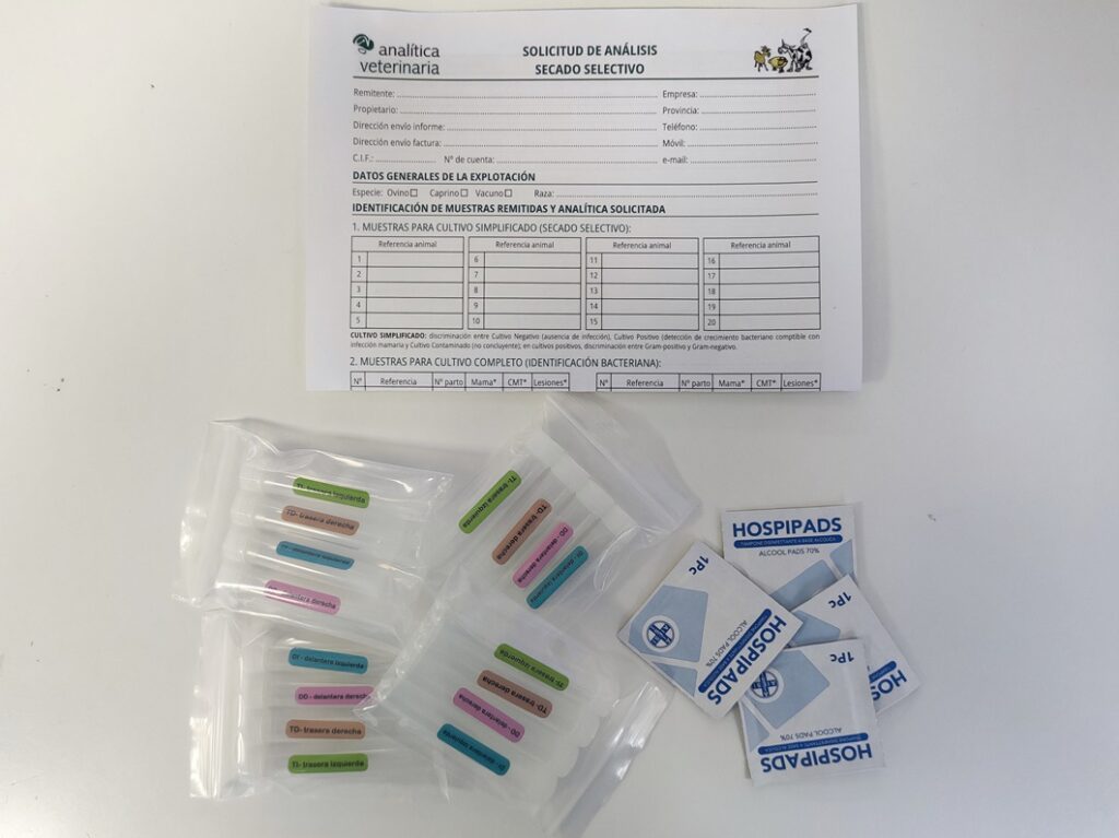 El Reglamento UE 2019/6 sobre medicamentos veterinarios establece que los medicamentes antimicrobianos no se utilizarán con fines profilácticos salvo en casos excepcionales. Por ello, solo se permite el tratamiento en el secado de animales con infección mamaria diagnosticada. Nuestro laboratorio ofrece un servicio enfocado al secado selectivo: utilizamos medios no selectivos y emitimos un resultado en un máximo de 48 horas. El resultado puede ser: positivo (presencia de infección), negativo (ausencia de infección) o contaminado (por mala recogida de la muestra). El resultado positivo se acompaña además de la discriminación entre gram-positivo y gram-negativo. No avanzamos más en la identificación del microorganismo para reducir el coste y ofrecer un precio competitivo. El KIT está formado por un embalaje que puede ser directamente enviado por mensajería. En su interior se incluyen pequeños packs individuales para cada oveja / cabra, con dos / cuatro tubos identificados para cada una de las mamas / cuarterones y toallitas hidroalcohólicas para la desinfección de los pezones, así como una ficha clínica de solicitud de análisis.